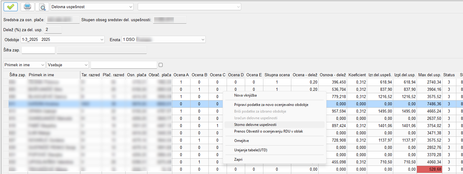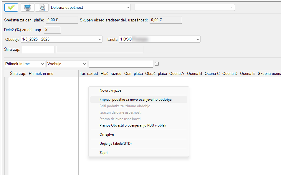 - V modulu Izračun delovne uspešnosti z desnim klikom odpremo meni in izberemo Pripravi podatke za novo ocenjevalno obdobje. (STATUS: 1)