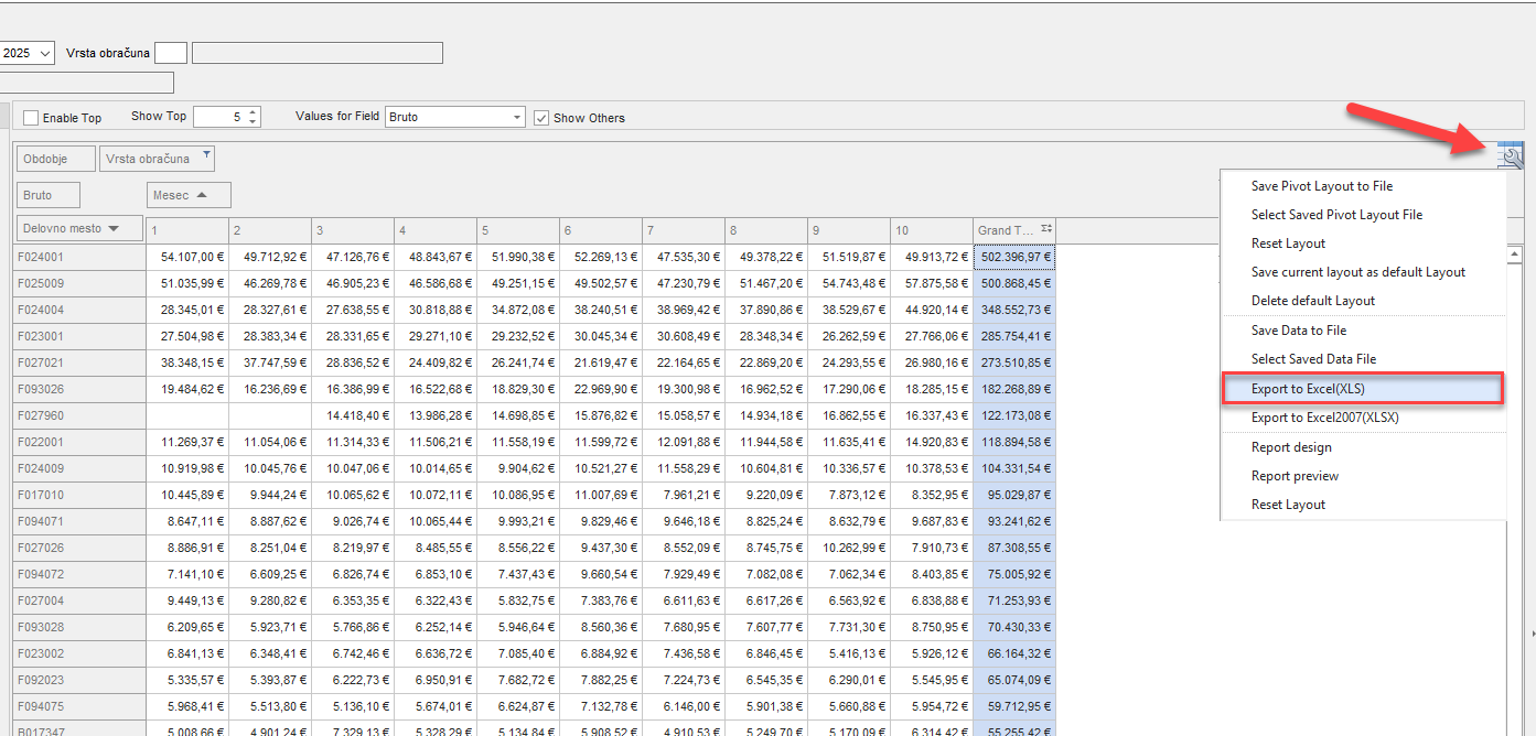Podatke, kot jih vidimo na ekranu lahko izvozimo v Excel. To naredimo tako, da v desnem zgornjem kotu kliknemo na ikono Orodja. Iz seznama izberemo Export data to Excel.
