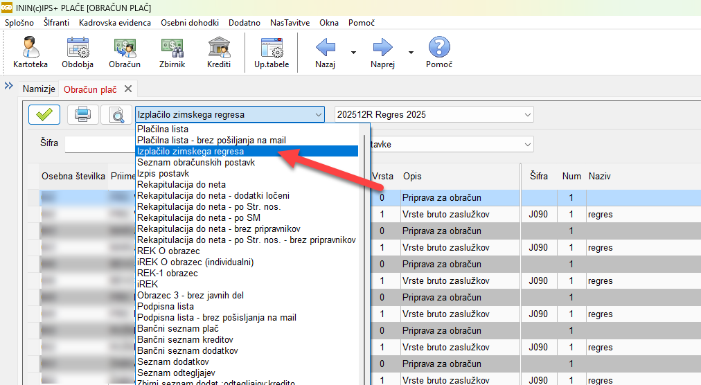 Poročailo je dosotopno na modulu Obračun. V sezamu poročil kliknete na Izplačilo zimskega regresa.
