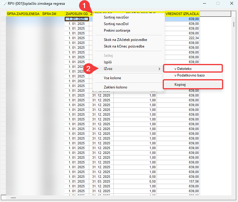Ob odprtju poročila se odpre PDF poročilo in okno s podatki. Za potrebe kopiranja podatkov v Excel, se postavite v glavo okna, z desnim klikom odprete meni in nato Izvoz > Kopiraj. Podatke lahko sedaj prilepite v Excel.