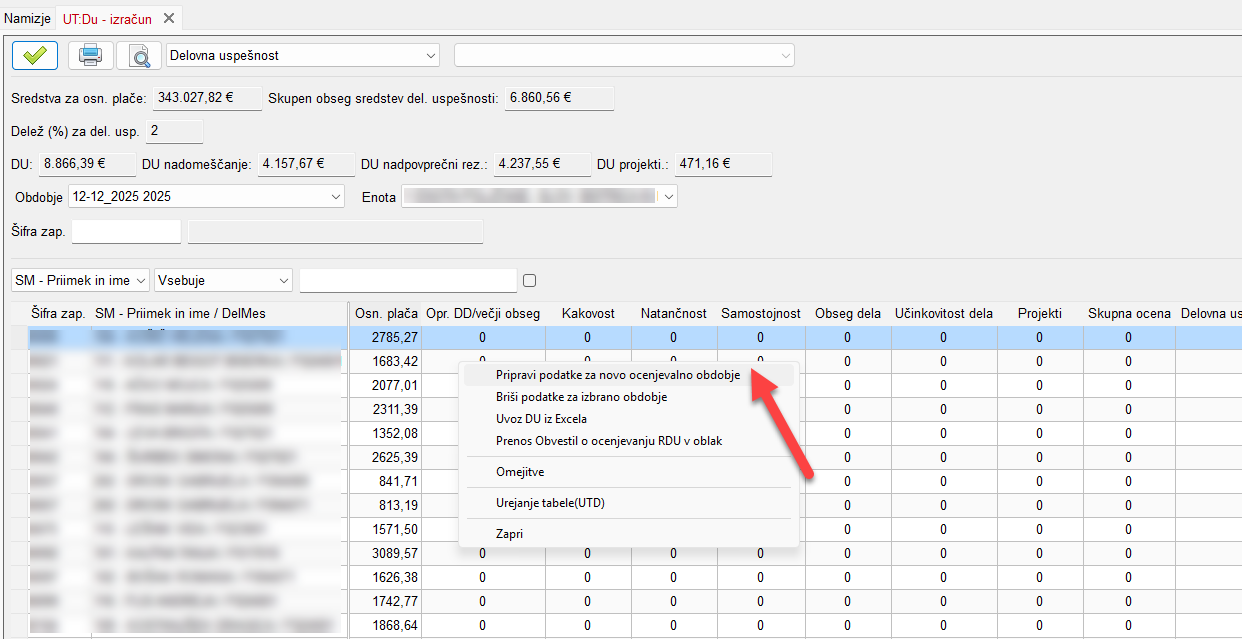 1. Pripravimo podatke za obdobje za katerega izračunavamo - z desnim klikom odpremo meni in kliknemo Pripravi podatke za novo ocenjevalno obdobje. S tem se nam ustvari novo obdobje. V polju obdobje v glavi modula mora pisati tekoče obdobje (Primer: 01-01_2026 2026).