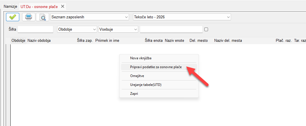 V tabeli Osnovne plače si pripravimo podatke o osnovah po obdobjih. Ko odpremo tabelo v praznem prostoru kliknemo desno miškino tipko in izberemo Pripravi podatke za osnovne plače. S to funkcijo dobimo podatke o osnovnih plačah za obdobja za katera računamo delovno uspešnost.