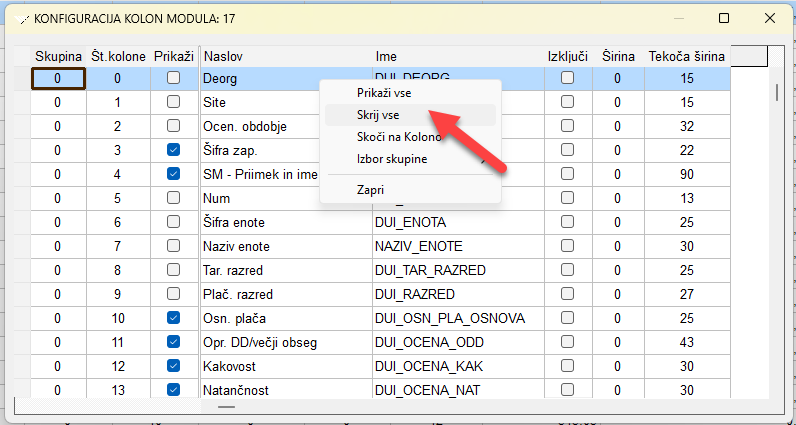 Odpre se nam seznam stolpev v modulu. Z desnim klikom odpremo meni in izberemo Skrij vse. Sedaj ni izbran noben od stolpcev (v polju Prikaži ni nobene kljukice).