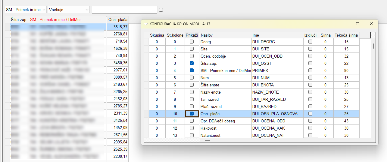 Nato postavimo kljukico v Prikaži pri Št. kolone 3, 4 in 10. Če smo naredili vse prav, vidimo v modulu zgolj 3 stolpce: Šifra zap., SM - Priimek in ime / DelMes in Osn. plača.