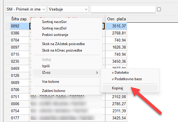 3. Izvozimo podatke in jih prilepimo v Excel (v prilogi) - ko imamo prikazane le tri stolpce, se ponovno postavimo na ime stolpcev in z desnim klikom odpemo meni ter izberemo Izvoz > Kopiraj.