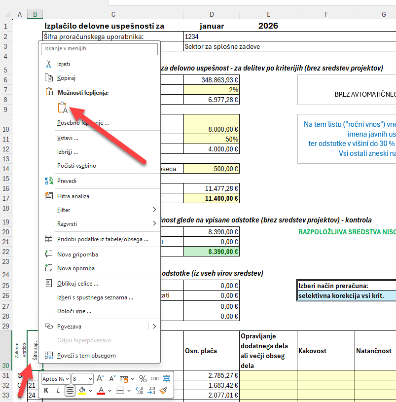 Odpremo Excel (v prilogi teh navodil) in se postavimo v celico B30 oziroma v celico Šifra zaposl. Z desnim klikom odpremo meni in kliknemo Prilepi. V Excel se nam prilepijo vsi zaposleni in njihove osnovne plače.