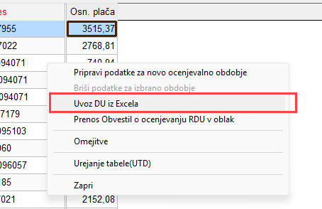 Nazaj v OSD se postavimo na podatke in z desnim klikom odpremo meni ter klinemo Uvoz DU iz Excela. Odpre se nam modul, kjer kliknemo Prilepi. Na enkranu se nam prikažejo podatki iz Excela in kliknemo Prenos. Sedaj se podatki prepišejo v modul Izračun DU.